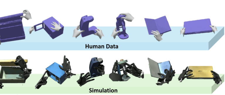 The policy receives detailed information about the hand, object, and task: Hand State: joint positions and velocities, fingertip poses, and actuator states. Object State: object position and orientation (quaternion), along with linear and angular velocities. Task Information: the goal pose of the object and task-specific features, such as a grasp indicator or success flag.