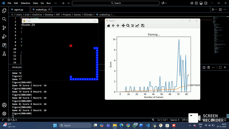 Trained a Deep Q-Network to learn collision-free Snake gameplay from state inputs.